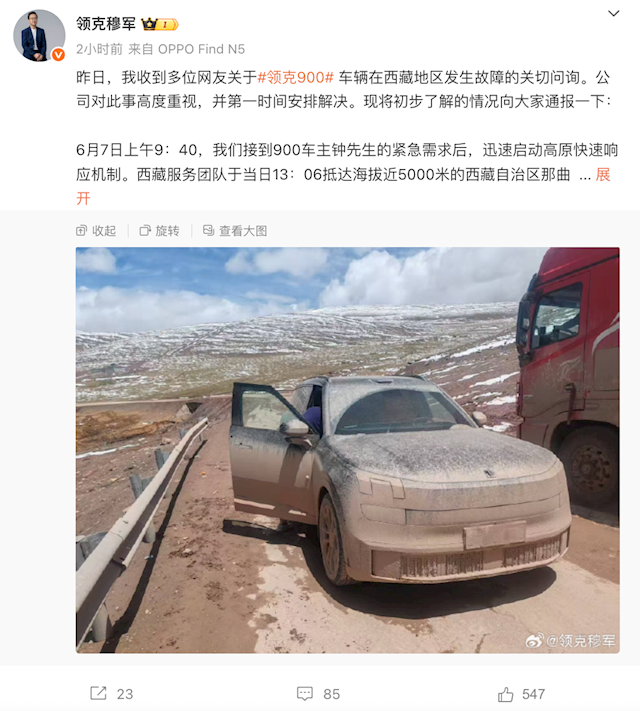 快科技6月8日消息,近日,领克汽车销售有限公司副总经理穆军发文回应了网友关于领克900车辆在西藏地区发生故障的问询,并公布了相关情况。